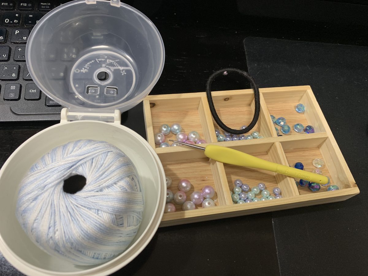 かつてはチューブクロッシェをやろうと思って1000個近い丸大(たぶん)ビーズを糸に通したあげく1段めで編み方がわからなくて挫折した私ですが、ヘアゴムにレース糸で大きめのビーズを編みつけるシュシュで「とりあえず練習で小さめのものを作ってみる」、さらに「練習なんだから終わったらほどいてビーズは回収すればいい」「そうすれば有限のビーズでも何度でも使える」ということを学習しました(ドヤ)。