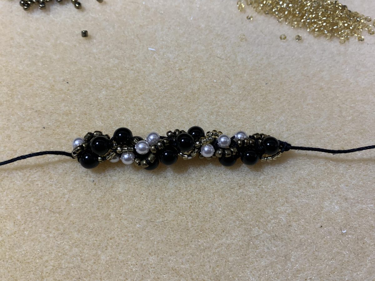 「仕上がりの長さに応じて、ビーズを竹→丸小→竹→丸小の順で通します(1・2段め)」