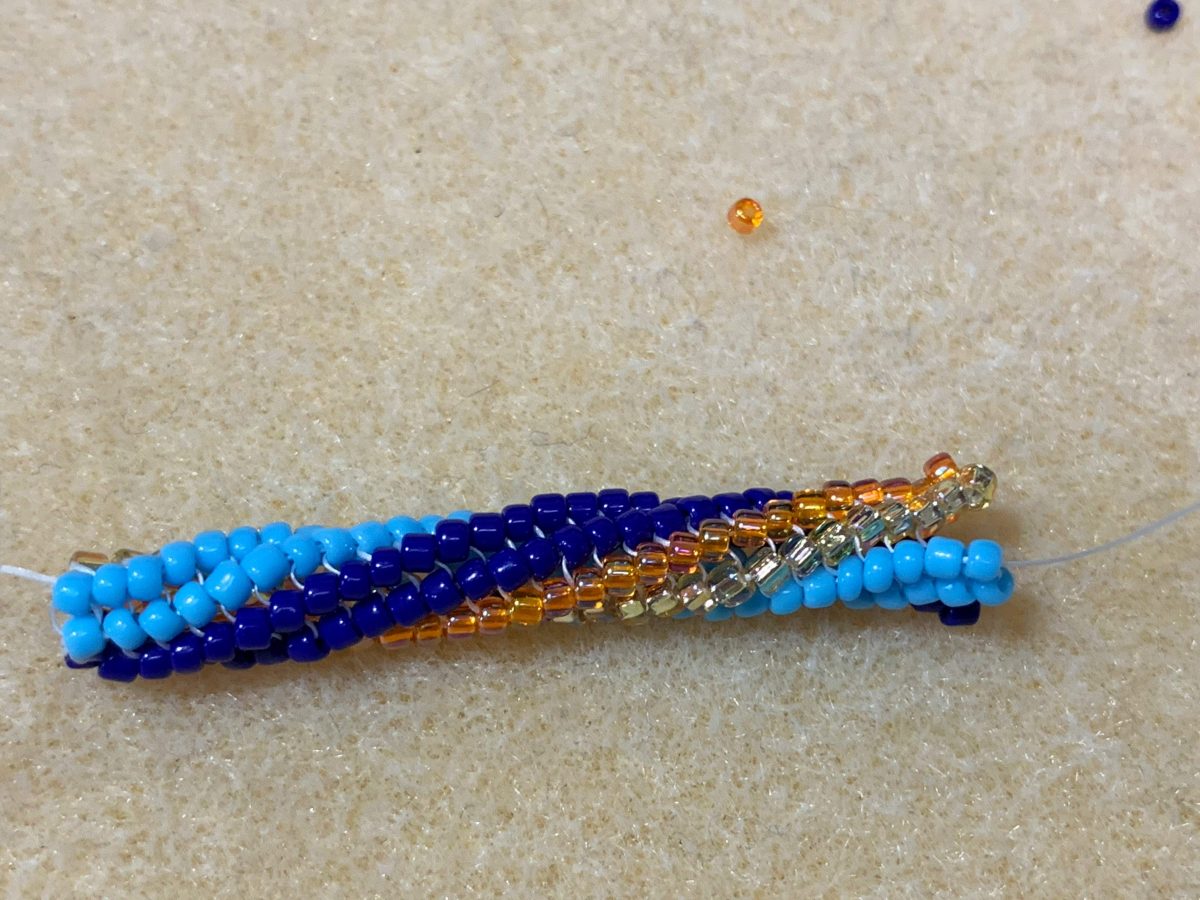ずっとお手本に見てたSapphirusさんの動画では「ペヨーテの技法でチューブを編む」「ブリックステッチの編みはじめを連続させてチェーン的なものを編む」みたいな応用がいくつもあるんですが、それはあくまでもこのかた独自の工夫で、(じっさい同じ技法の動画をあげてらっしゃるかたは目にしたことがないですし)一般的なペヨーテステッチっていえばでこぼこの絵や文字の入った子供っぽいストラップを作るのがメインかな、と。
